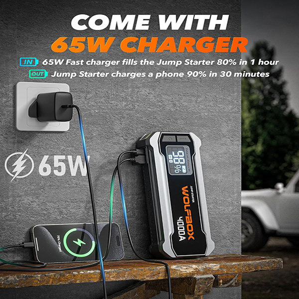 24000mAh&4000A Jump Starter - With a powerful 24000mAh battery, this car battery jump starter is well-suited for 12V vehicles like cars, trucks, boats, and larger vehicles. wolfpack effectively restores your vehicle's power in emergency situations, supporting both gasoline and diesel engines with a capacity of under 10 liters